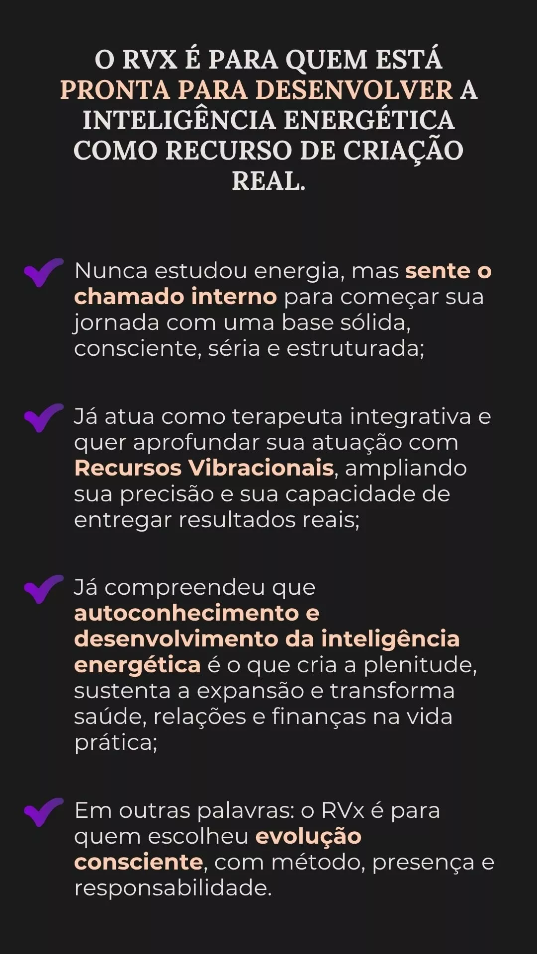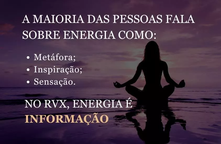 O RVx (Recursos Vibracionais - O início) é um método completo, com base filosófica e neurocientífica, que reorganiza sua energia a partir de três pilares: presença, sobrecriação e da intenção.